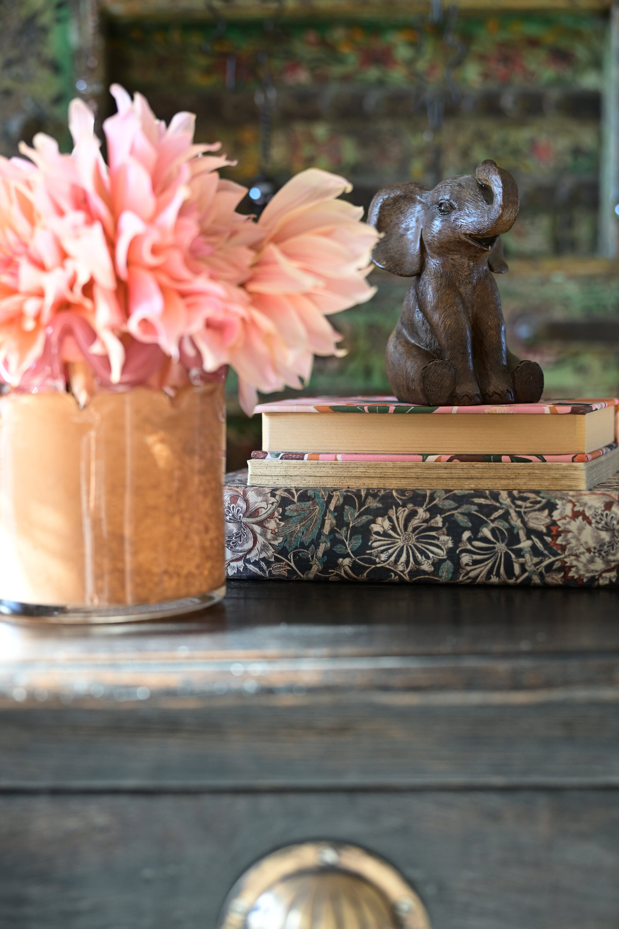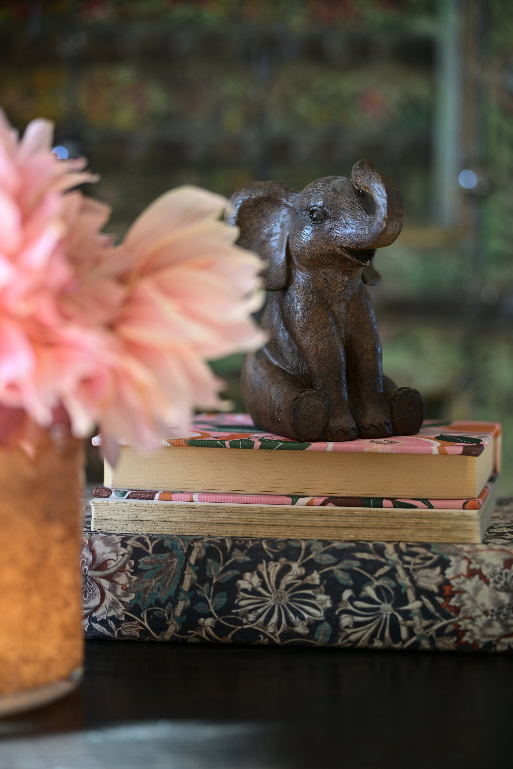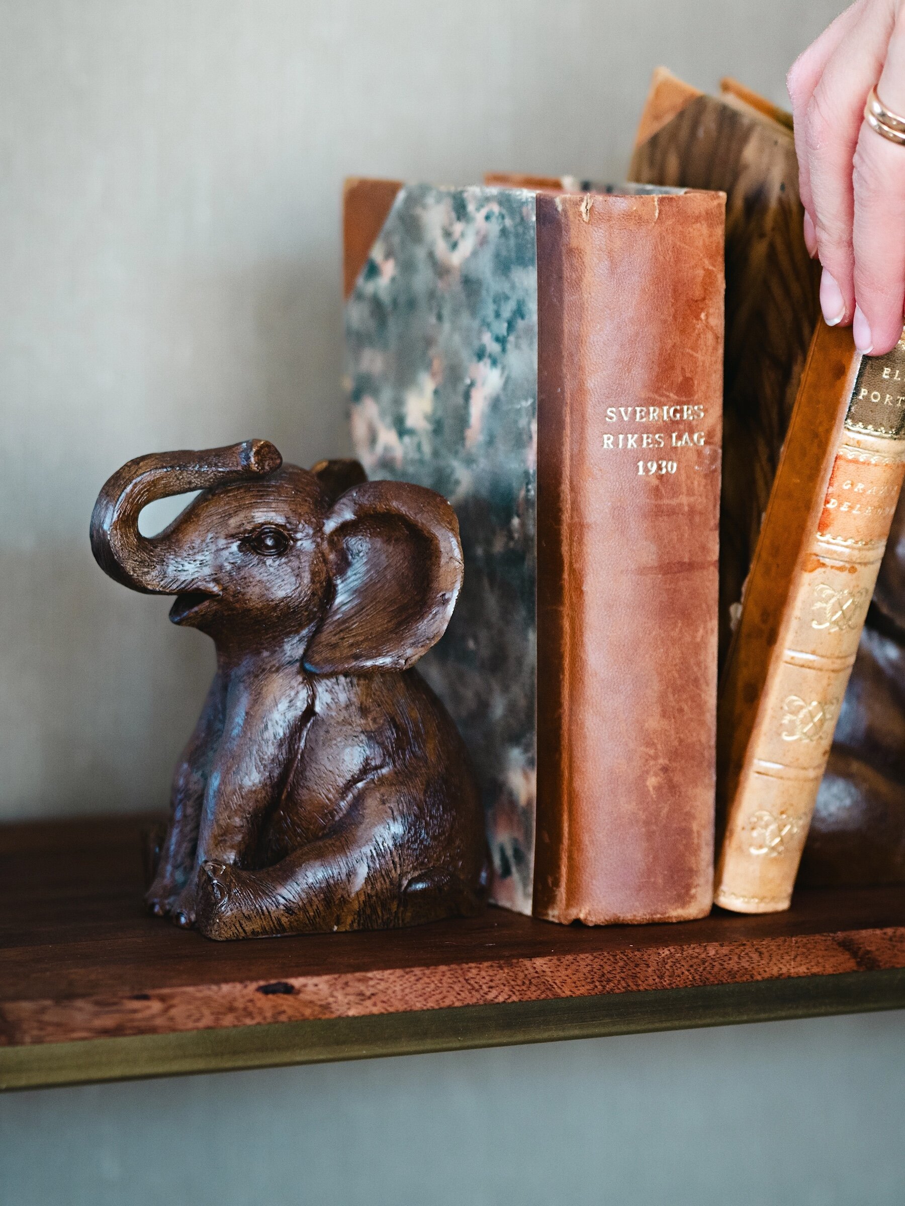 Ursöt, sittande elefant med träliknande finish. En dekorativ figur som passar lika bra som prydnad, som bokstöd mellan bokraderna. Tillverkad i poly.