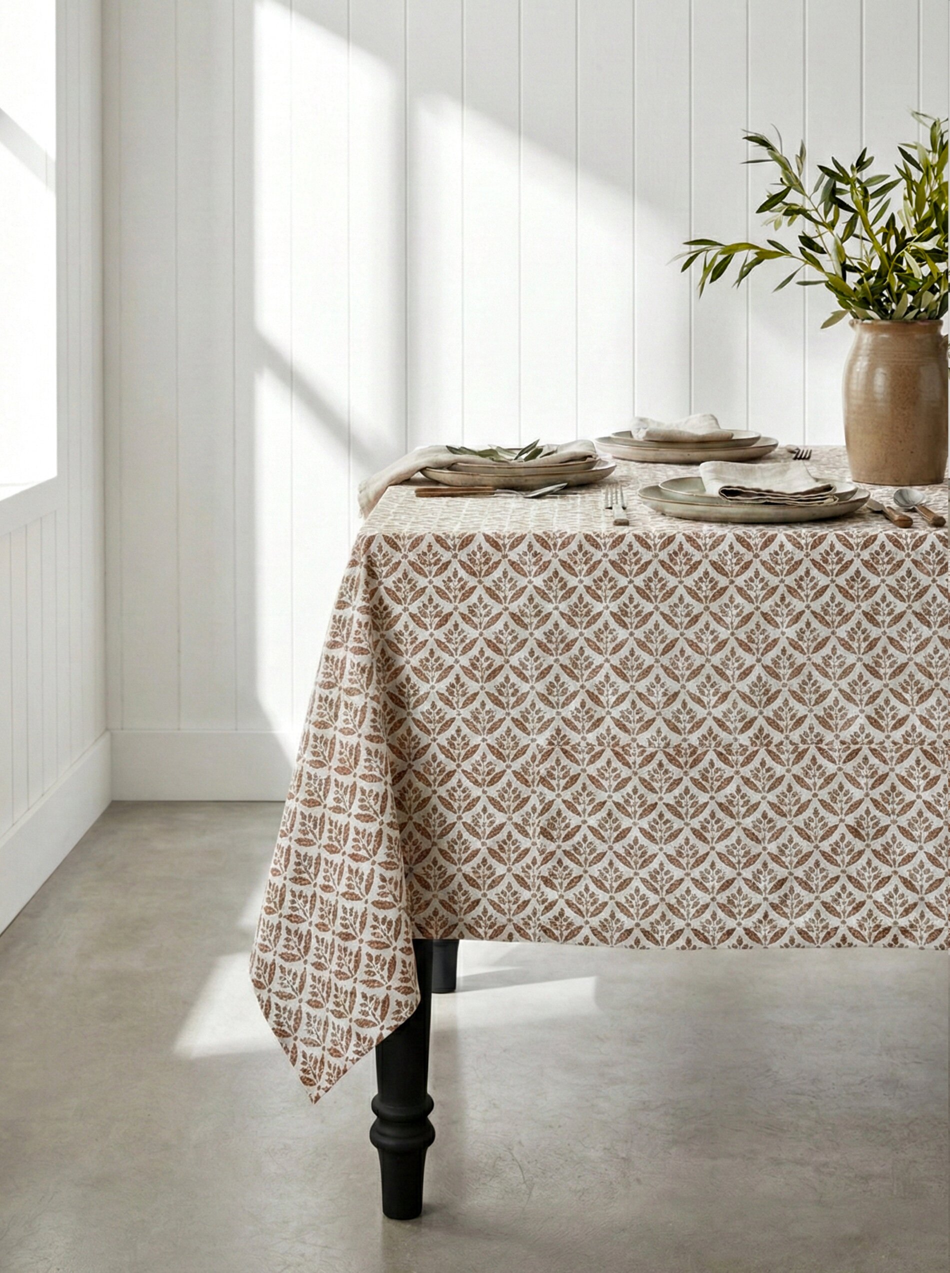 Bordsduk med antikvit botten, som möter ett brunt schablonmönster som skapar liv utan att ta över – tidlöst, lugnt och väldigt lätt att tycka om. Det krinklade tyget faller naturligt över bordet och bidrar till ett mjukt uttryck där inget behöver vara perfekt. En duk som känns lika rätt till vardagsmiddagen, som till långsamma helgfrukostar och middagar med vänner. En bordsduk är en enkel detalj, som gör så mycket för helheten.