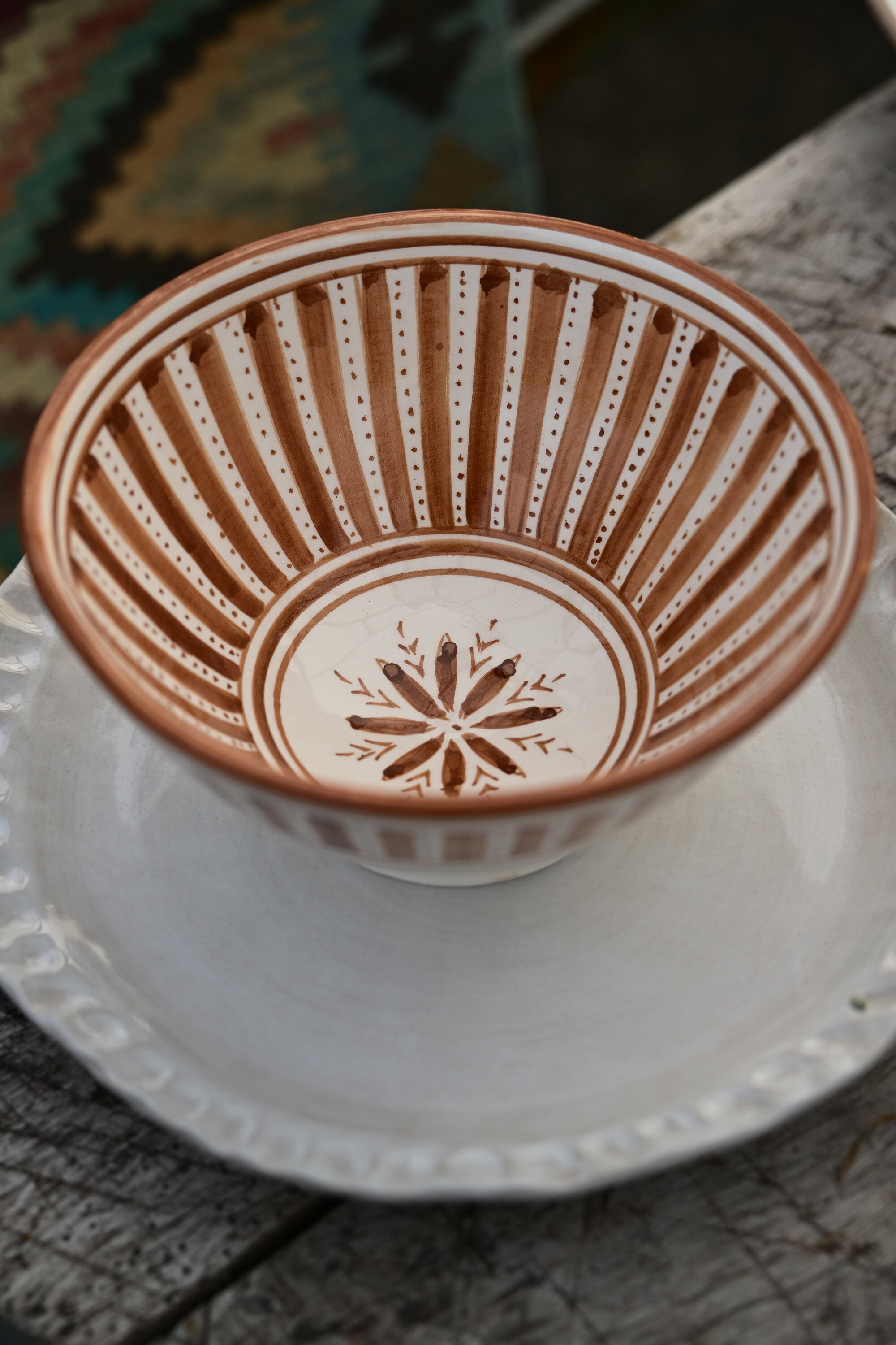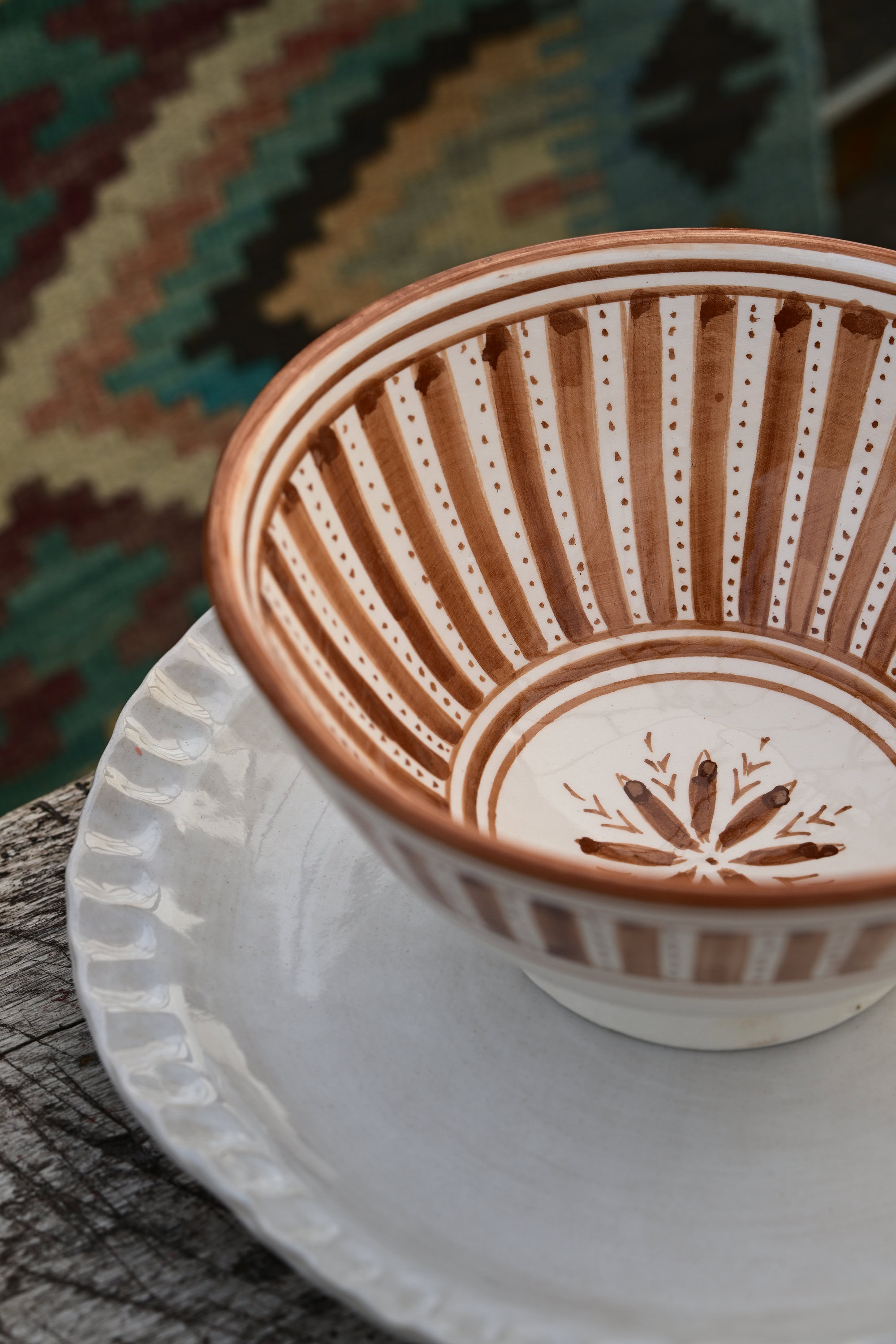 Alldeles ljuvliga handmålade skålar från Marocko. Denna genuina marockanska keramik är blyfri och tål både mikro och diskmaskin. Servera röror, sallader och låt keramikskålen bli ett smycke på bordet däremellan. Välj mellan olika färgsättningar och motiv. Eftersom skålarna är handmålade kan det skilja något mellan toner och vissa målade dekorelement, vilket speglar det genuina hantverket.
