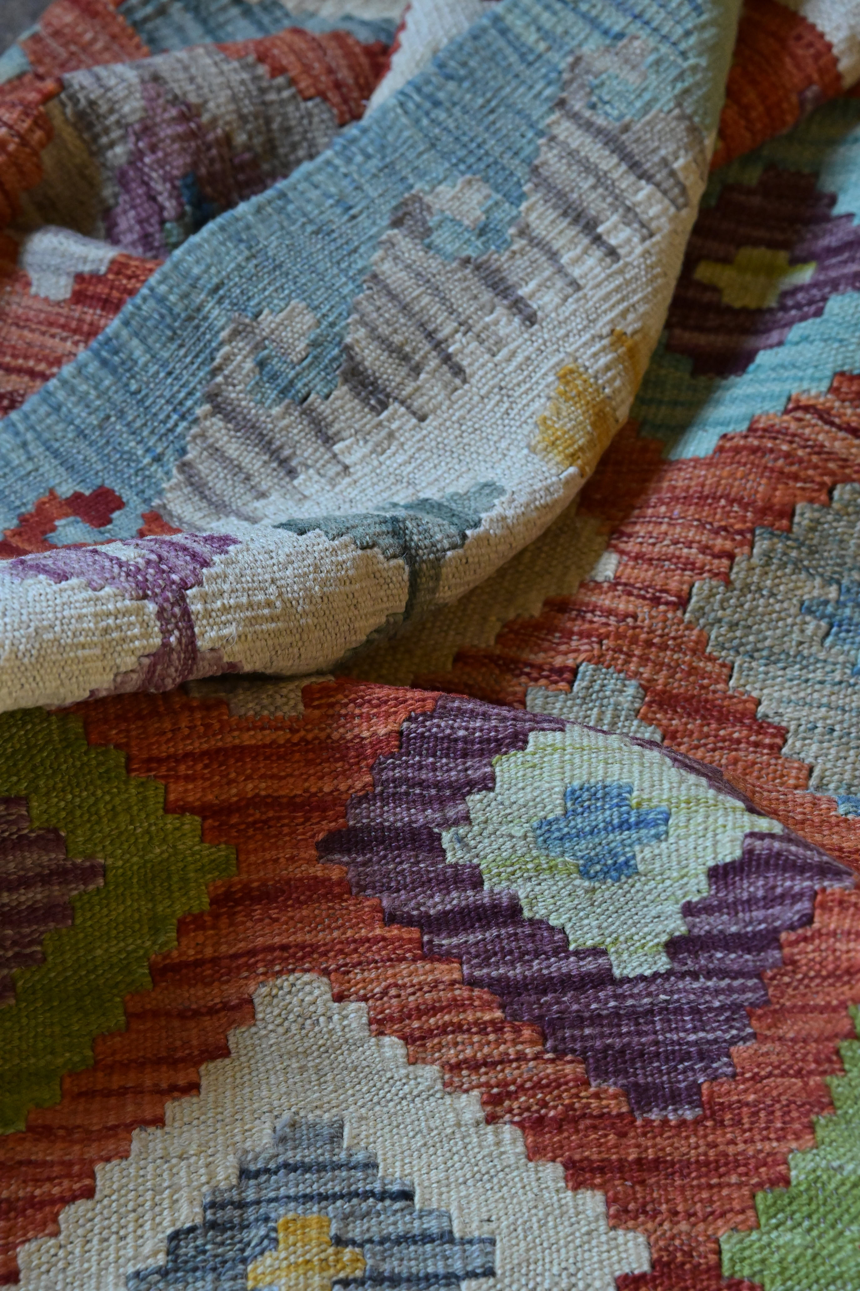Handvävd kelimmatta av ull med modern mönsterbild. Mattorna tillverkas med traditionell kelimteknik och naturlig färgskala med geometriska symboler och romber. Kelim är persiska och är själva benämningen på hur kelimmattan är vävd, en typ av orientalisk slätvävnad, som närmast kan liknas vid röllakanstekniken. Mattan är vändbar, där mönstret framträder lika tydligt på båda sidor.