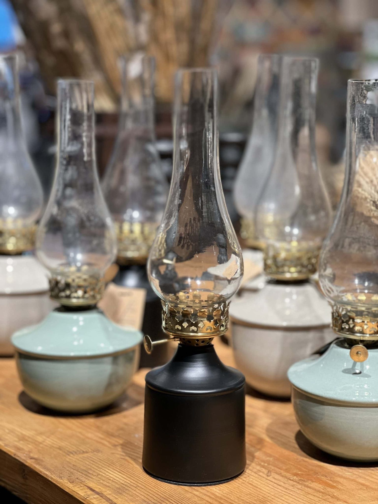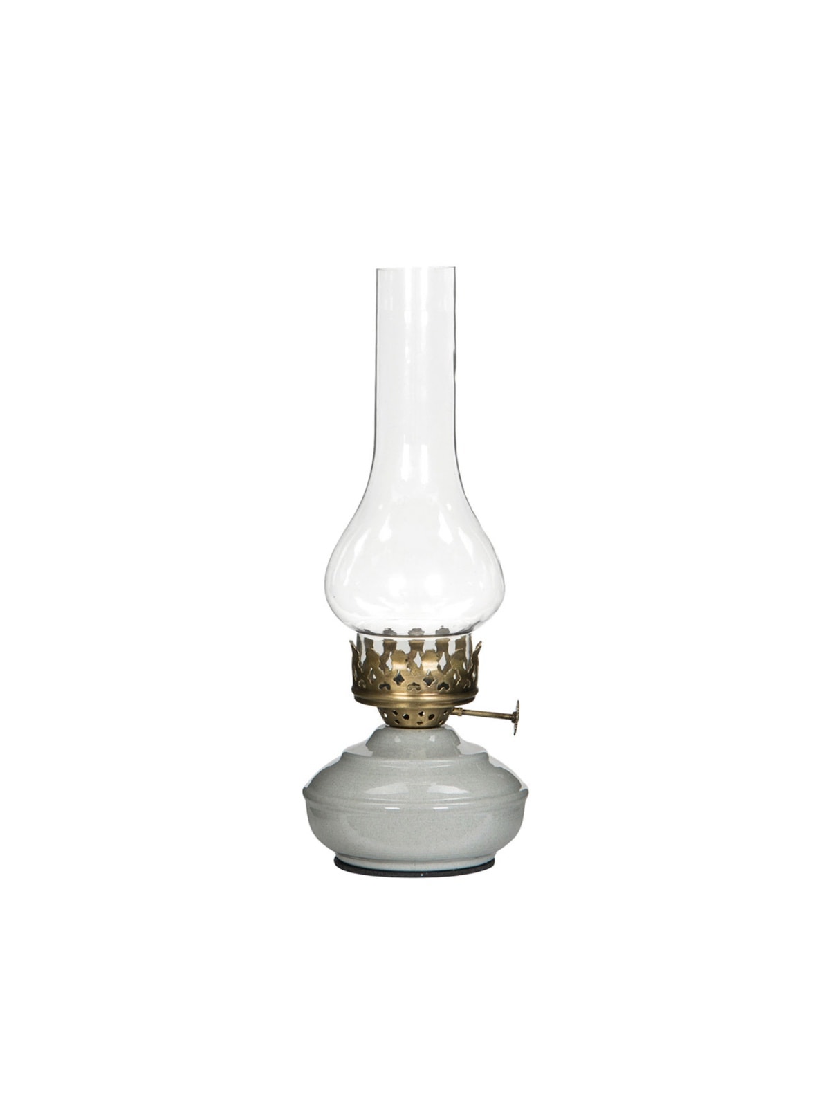 Urfin ljuslykta i klassisk oljelampsmodell, men här med plats för värmeljus. Emaljerad fot i gråprickigt utförande. Guldig värmeljushållare med skyddande cylinderglas, som lyfts upp.
