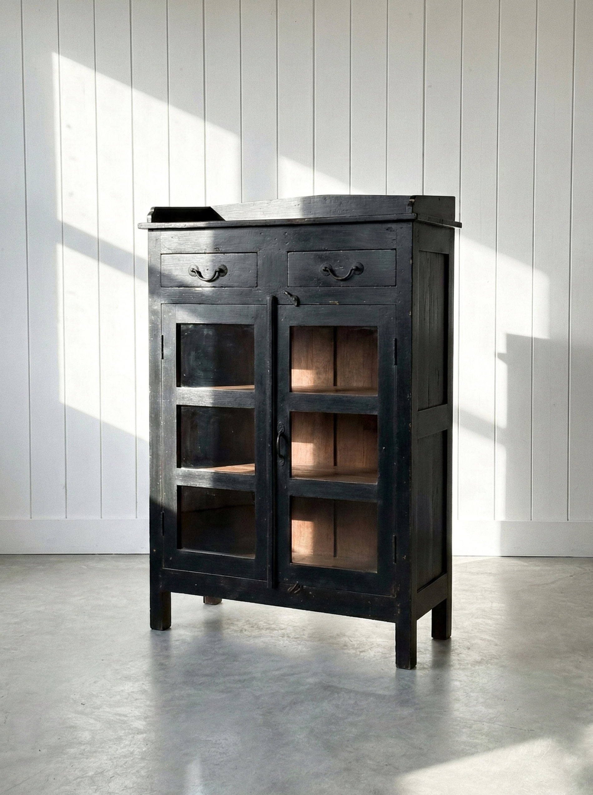 Gammalt vitrinskåp med lådor