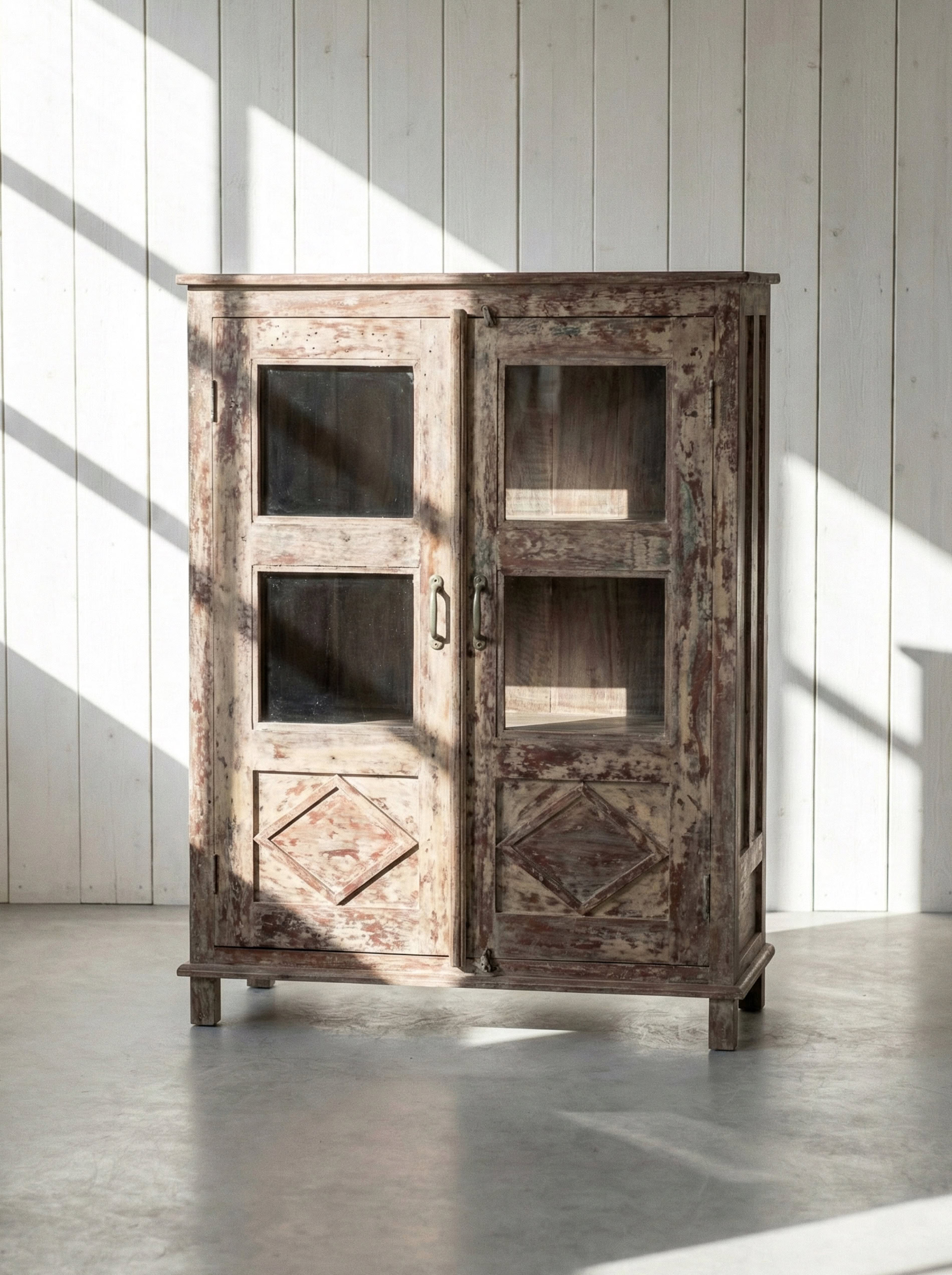 Magnifikt lågt vitrinskåp med arbetade sidostycken